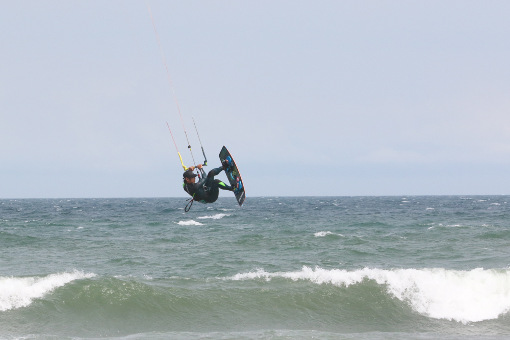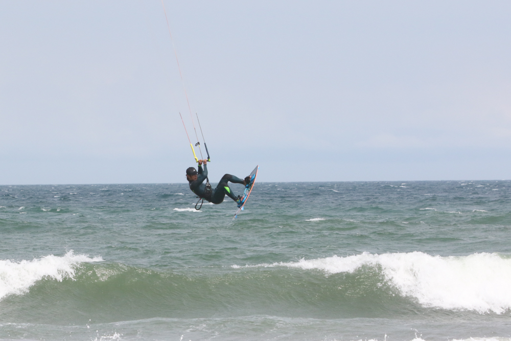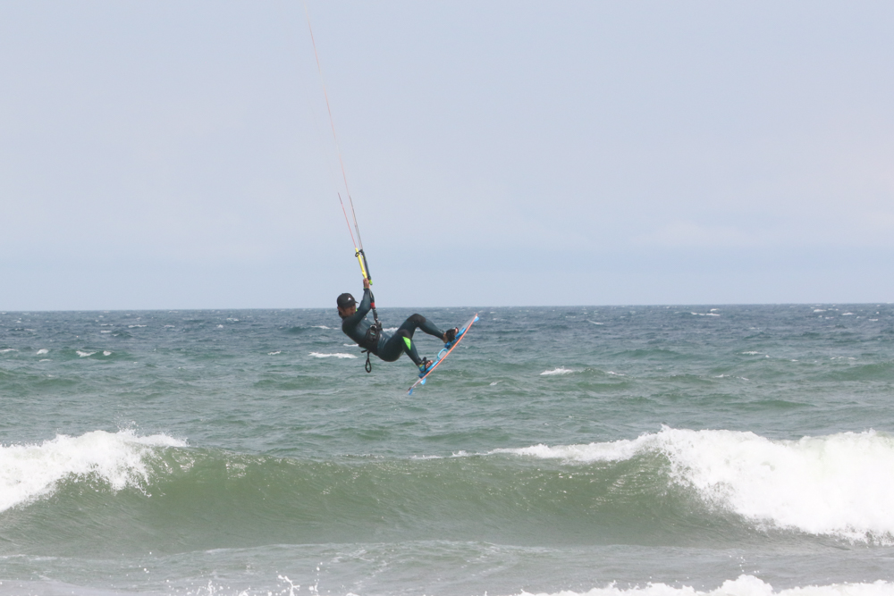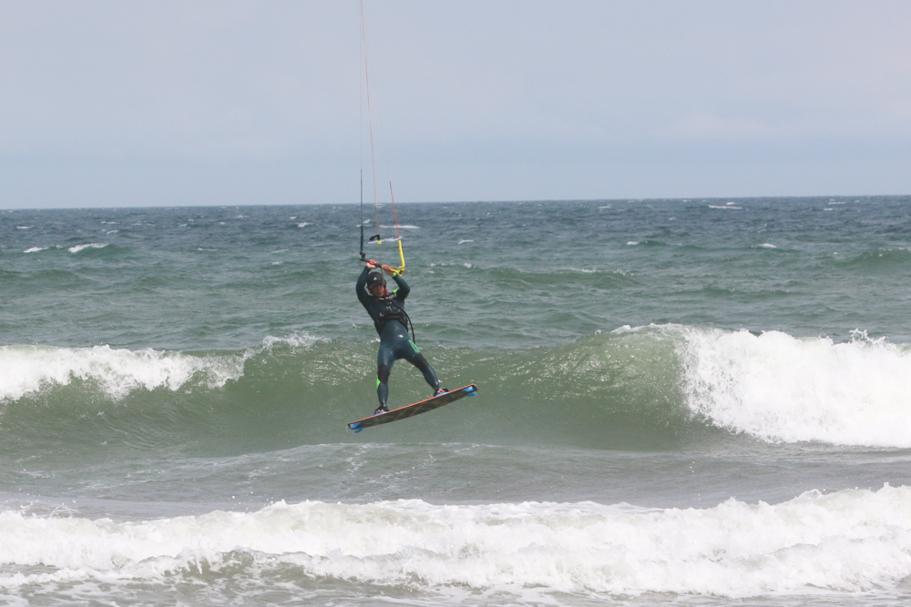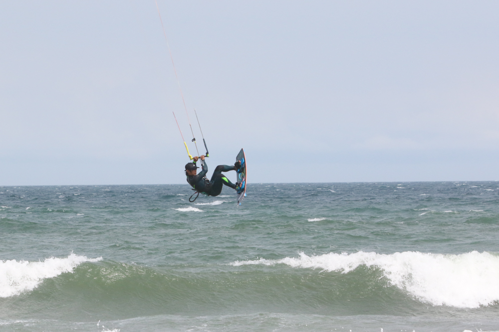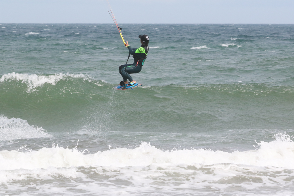 風が強くなりさすがにカイトフォイルはDaveさんだけになりましたがインサイドセクションではトリックを楽しむKouheiくんが目立っていました。