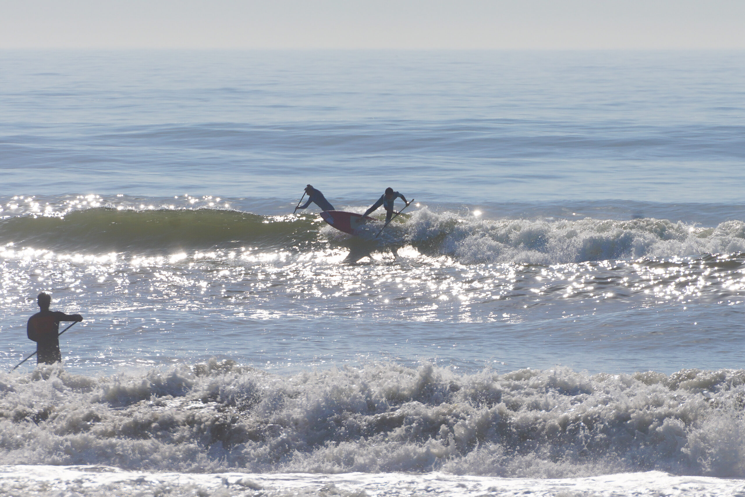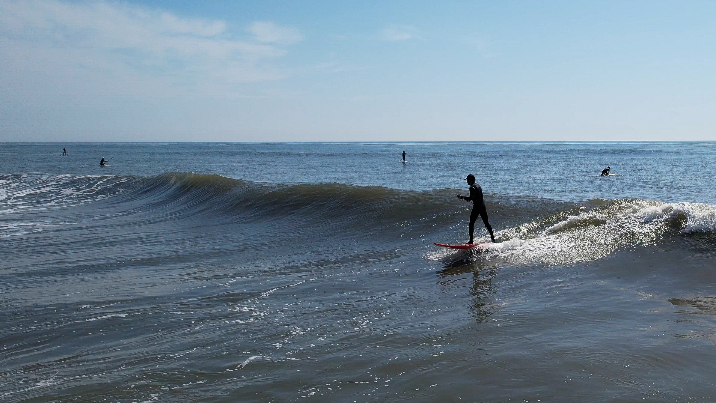波は昨日よりサイズダウン、アウトサイドでは胸たまに頭くらいのブレイクでSUPサーフメンバーがライディング。