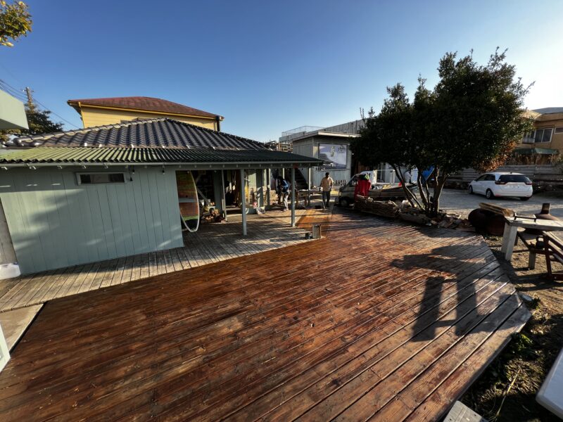 デッキ補修工事 day2 昨日に引き続き今日もショップのウッドデッキ補修作業。 本日もJasonさんのビックヘルプにより一日ですべての作業が終了。 朝はいい波で波乗り、お昼前から作業をスタートし夕方には長年メンテナンスできなかったデッキに塗装すること... -