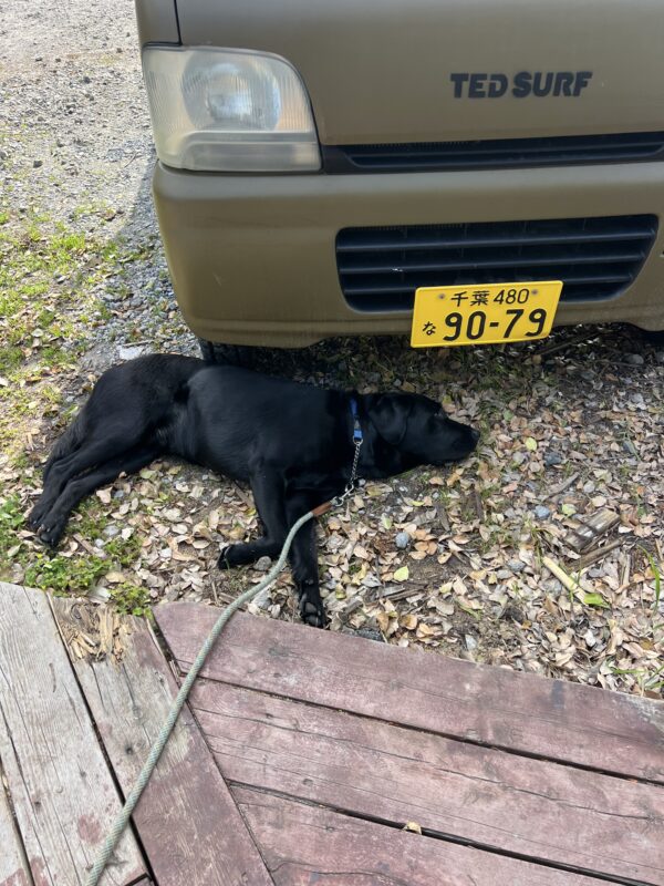 デッキ補修作業をしている横で日向ぼっこのカイノア。