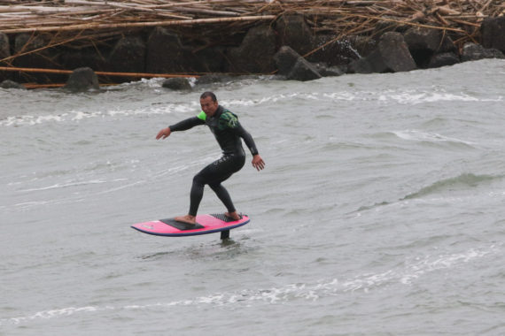 2018.04.13 朝は無風コンディションでしたが時間が経つとオンショアに触れてしまいました....がフォイルサーフにはノープロブレム。 風波からリフォームするうねりでSUPフォイルを楽しむKimizukaさん 短期間でだいぶフォイリングのコツをつかめているのは... -