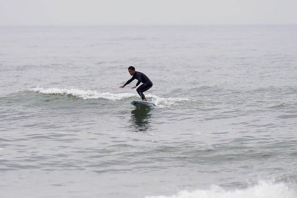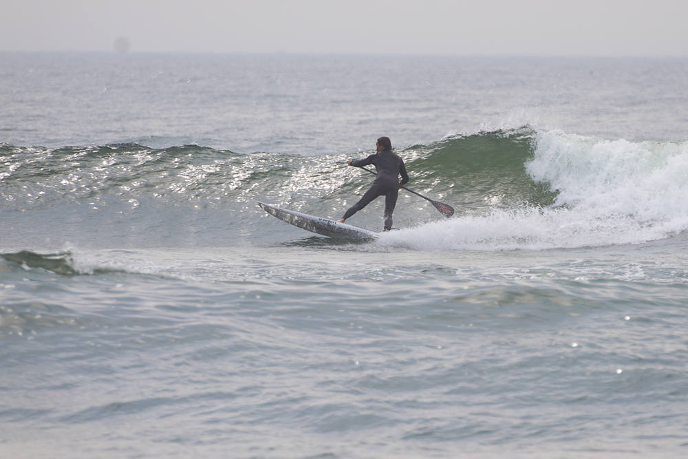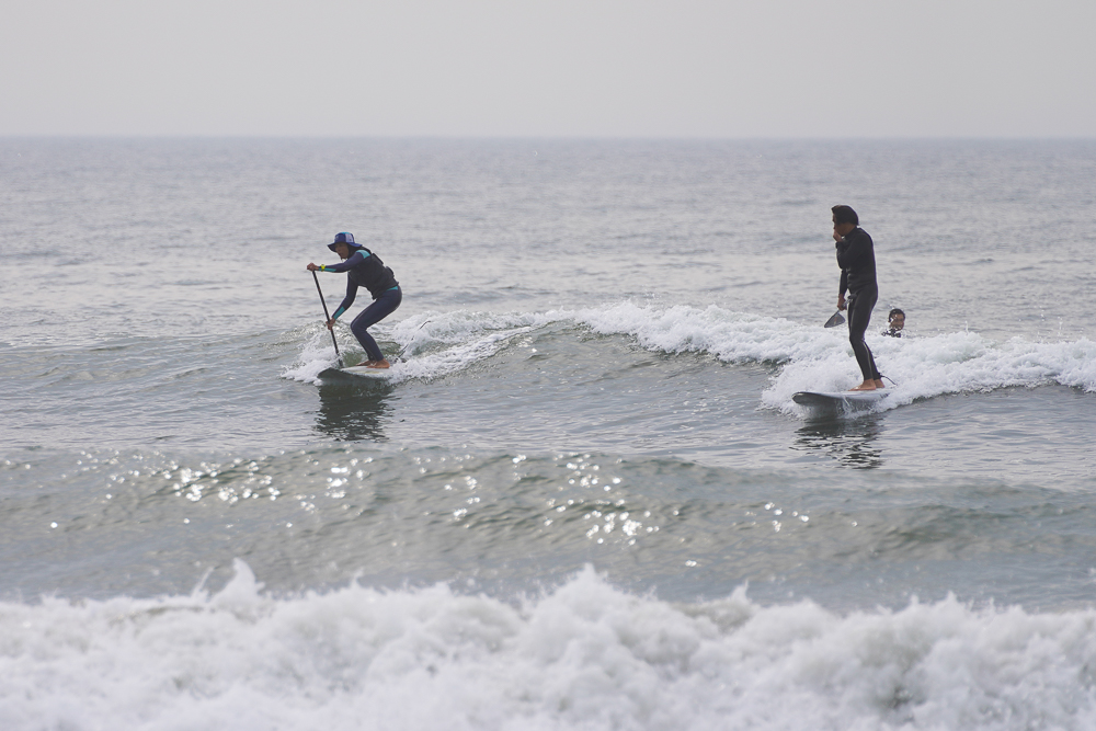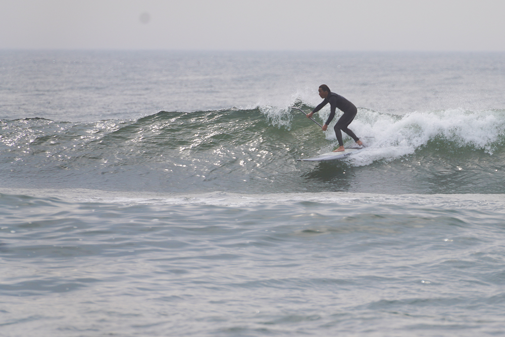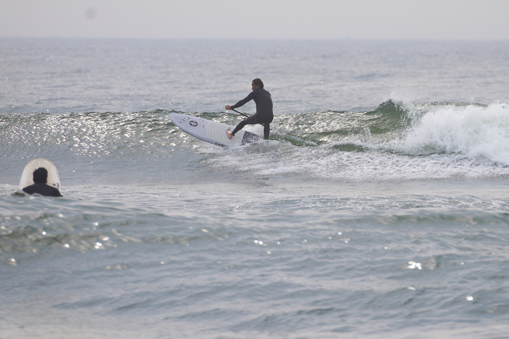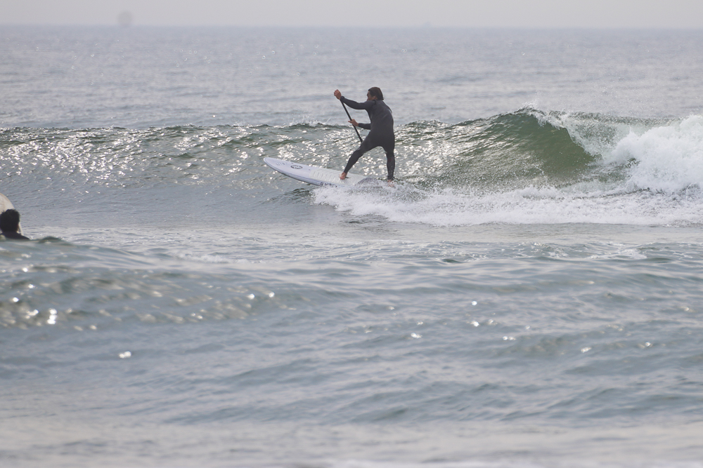 風のないショップ裏でのSUPサーフセッション