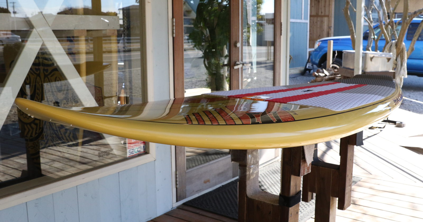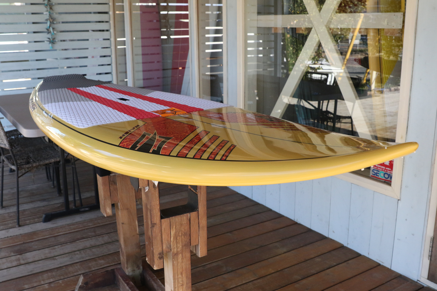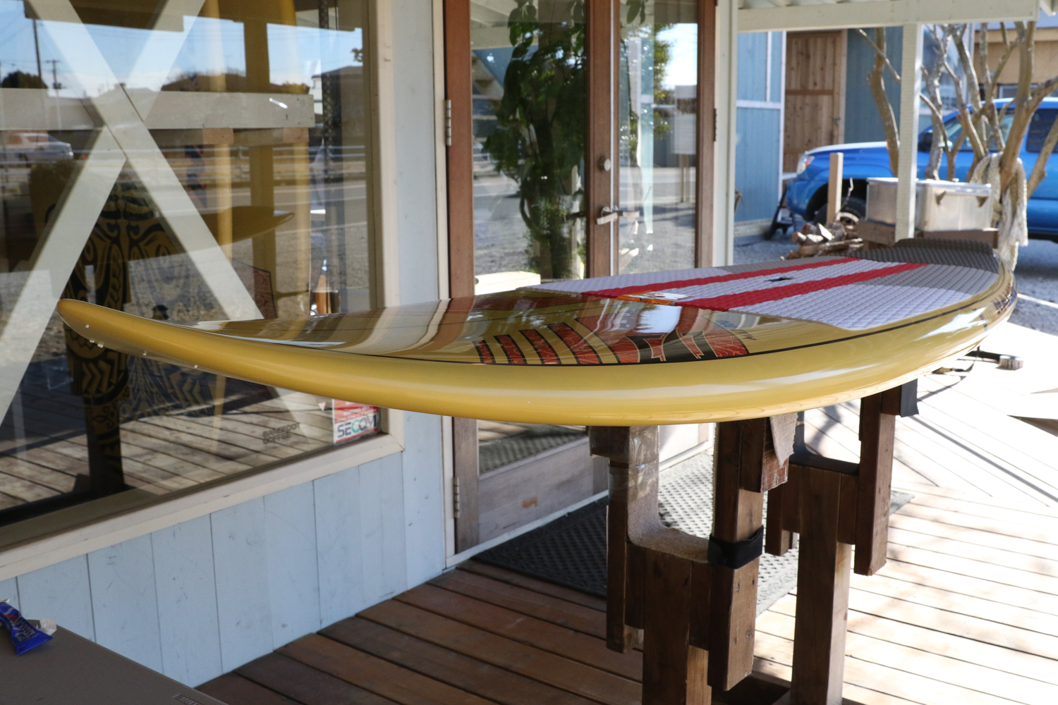 X32よりもアウトラインが細くなっているのでパドルでの直進性が増しているので早めのテイクオフが、ホクアシリーズよりもハイボリュームなデザインが波待ちやゲッティングアウトをレベルに問わず楽におこなうことが可能なボード。
