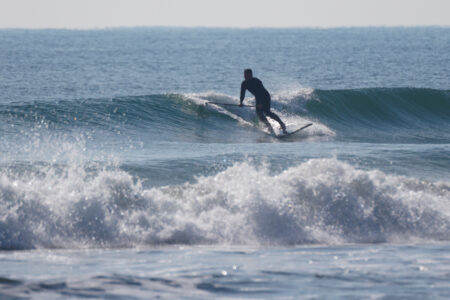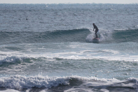 朝は予報に反してのほぼ無風南西、オフショアコンディション、時間帯によっては波もまとまりいいコンディションでみんなSUPサーフ楽しんでいました。