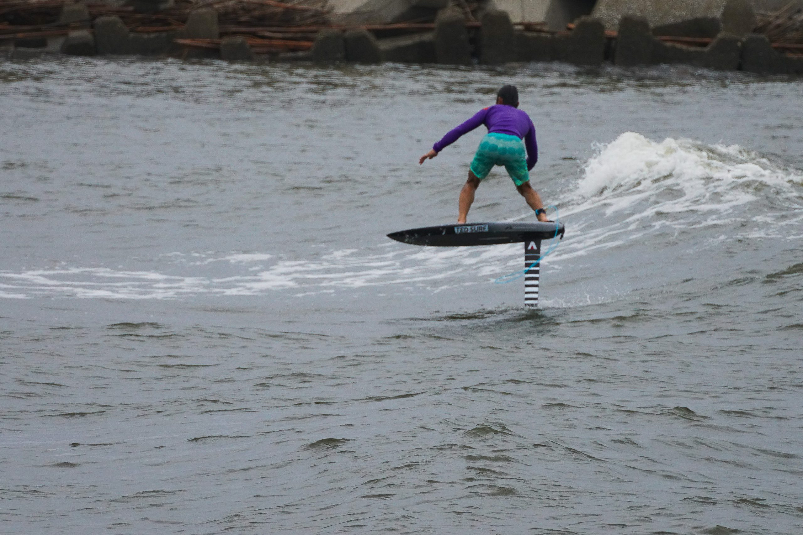 SUPフォイルでクレージーなテイクオフをメイクするOKMさん。